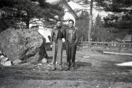 | Kurt Svarfvar till vänster och Hemming Boijer, klädda i skinnjackor. Oklart var fotot är taget. Kurt, ofta kallad "mutta-kurt" och Hemming, Vasabo, med rötter hos "Laans" på Näsbacken | |