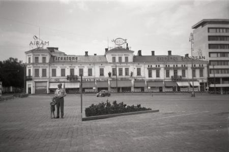 | Foto från nedre torget i Vasa. I bild Gerhard Rosendahl och sonen Anders. Gerhard gift med Viola Boijer från Vasa,flyttade till Sverige på 1950-talet. sonen Anders föddes i Sverige. | |