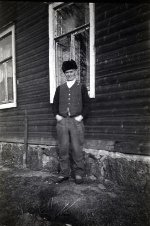| Karl Boij, "Laans-Kaal" stående vi gaveln av sitt hus på Näsbacken i Tölby. | |