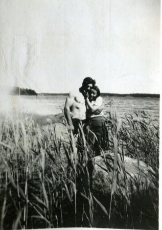 | Emil son till Josefina och Johannes Rodas, Tölby med sin nyblivna hustru Anna-Liisa Toikkanen, hemma från den del av Karelen som avträddes till Ryssland 1944. Fotot taget vid Emils hemgård "Finnas" i Tölby. | |