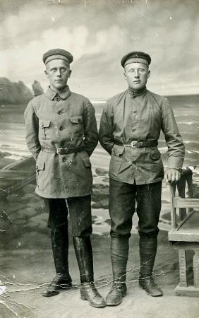 Fotoateljé fotografi av 2 st Tölby män; Arvid Österholm & Evert Påfs i militär uniform under 1910-tal. Texten på mössorna hänvisar till finska, vilket kan betyda att de tjänstgjorde i flottan antingen under Finska inbördeskriget, eller senare för Finland, eller tidigare för Tsar-Ryska flottan. Dock värt att noterna skillnaderna på bådas uniformer, där skjortorna, stövlarna och byxorna har klara skillnader. Tjänstgjorde de på samma ställe? eller hade de varsina uppgifter i det militära på olika håll?