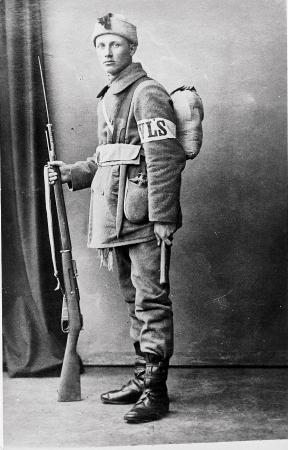 På armen finns armbindeln med bokstäverna; VLS, som betyder Vasa Läns Skyddskår.