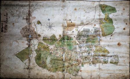 Lantmäterikarta uppgjord 1750-1753. I bykistan finns flera kartor från samma tidsperiod. Kartan avbildar byns bosättningscentrum. Flera kartor över skiftade åkrar finns ritade på andra kartor.