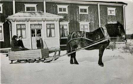 Bakom mjölkvagnen står dottern i huset Ines Björkén född år 1911 framför framdörren till huset.