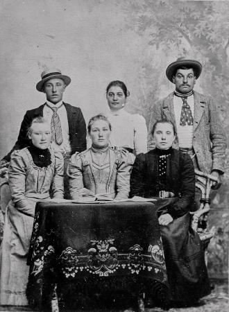 Sittande från vänster: Selma Thölix, "Nissus-Selma" f. 1886 gift Norrgran, Anna Tätting, "Tettis-Anna" f. 1880 gift Järv i Dragnäsbäck, Josefina Borgar eller Ehn "Finnas-Fina" f. 1885 gift Rodas i Tölby. Stående, Erik Thölix "Nissos-Erik" f. 1884, Maria Tätting "Tettis-Mari" f. 1885, Erik Tätting "Tettis-Erik" f. 1878.