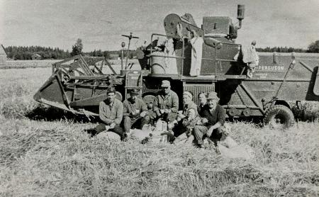 Emil Rodas inköpte sin självgående skördetröska år 1960. Få tröskor fanns i byn vid den tiden och många anlitade Emil och hans skördetröska av märket Sampo. På bilden från vänster, Jörgen Österholm född 1944, Jan Österholm född 1943, Emil Rodas född 1912, Anna-Liisa Rodas född 1919, Katarina Eklund född 1964, Sig-Britt Eklund född 1942, Estrid Rodas född 1924.
