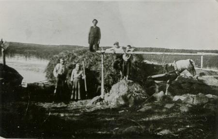 Om det var lågvatten på Fladan kunde fräken torkas på stubben ute i vattnet och fördes efteråt till Bolotlandet med ekstock. Torrt fräken har här på bilden lastats på "laangflakan" för att föras åt Johannes Rodas som hade två kor som behövde vinterfoder. .