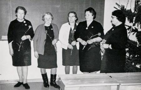 Fotografi av förtjänstteckens utdelning till Tölby Marthor den 27 december 1971 vid skolan.