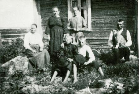 Sittande från vänster: Ulla Forth "Haga-Ulla", barfotapojkarna Robert Forth och Valter Rodas, August Forth med hunden. Stående från vänster: Alma Forth "Haga-Alma" och Maria Fred "Torparis Mari".