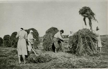 Här lägger Vivi, Hilma och Aili Forth gårdagens slagna hö på störar för torkning. Karl Forth stöter med järnspettet hål i marken för störar. Emma Thölix från Vasa betraktar det flitiga arbetsgänget, stödjande sig mot gaffelskaftet.