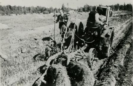 Fotografi av en Vasatraktor i plöjningsarbete år 1944.