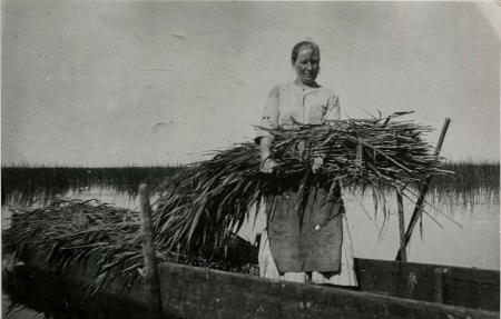 Fotografi av Alina Rodas som bär en famn av rör-vass som bärgats som tillskottsfoder för hennes kor på Bolot.