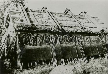 Tätryssjor på tork hos Einar Rosendahls båthus nu mera Alf Rosendahls båthus (ett barnbarn åt Einar). En ryssjerad bestod av 24 ryssjor och 12 stängarmar. På bilden tätryssjor vilka "sattes ut" genast efter islossningen. I dessa ryssjor fångades gäddor, abborrar, mörtar och någon enstaka idar och braxnar.