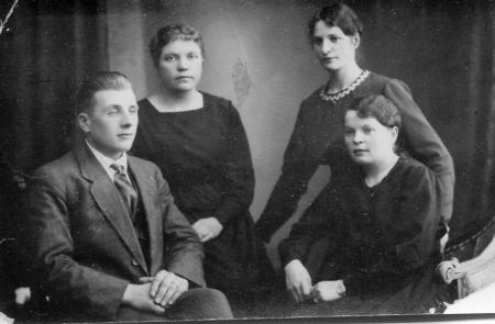 Sittande i bild Johannes och Ester Påfs f. Enegren. Stående i bakgrunden Ester Smeds (Svarfvar) och Edla Österholm gift med Alfred Martin i Tölby