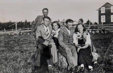Mannen sittande andra från höger är Emil Rodas, de övriga okända liksom platsen för fotografiet..