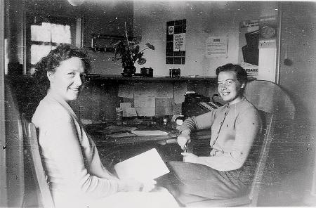 Fotografi av Rut Backman och Greta Martin i Korsholms Sparbanks lokal i Tölby.