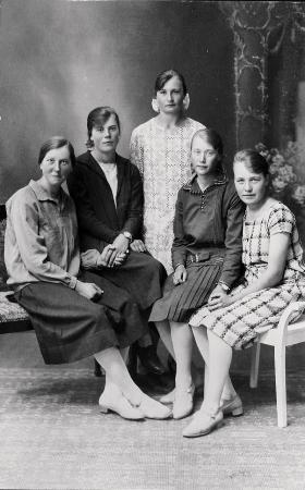 Från vänster på fotografiet: Saida Backman, Ingrid Forth, Svea Forth, Siri Thölix och Elvi Boij. Ateljéfoto taget i Vasa.