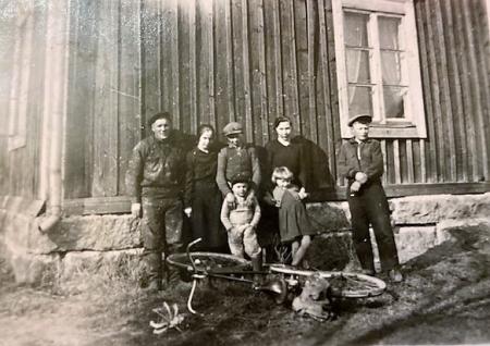 Från vänster, Harald Martin, Signe Enegren, Otto Martin, Edit Antfolk, Birger Påfs. Stående nedanom, Börje och Saga Påfs.