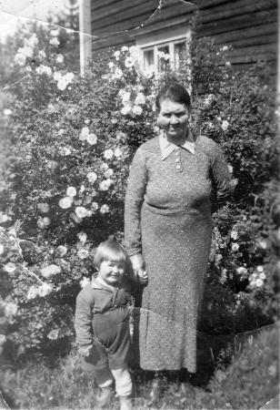 Matilda och barnbarnet Bror fotograferade utanför Matildas gård.