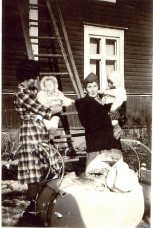 Tvillingarna Yngve Roland i sin mor Siris Famn och Ida med Tage Vilhelm. Fotot taget 1950 vid Villis.