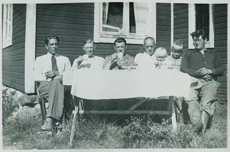 Längst till vänster Runar Backman, i mitten Emil Rodas och till höger Ensio Elfström. de övriga okända. Även platsen okänd.
