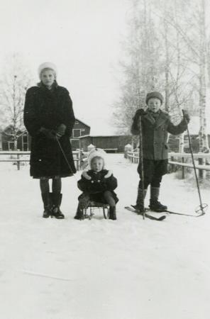 Storasyster Doris, lillasyster Lisbeth och mellanbarnet Roger. I bakgrunden uthuslängan vid Finnas. Fotot taget julen 1949.