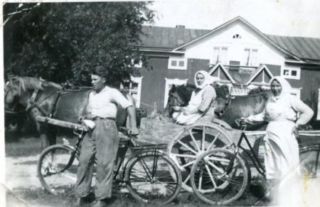 | Emil son till Josefina och Johannes Rodas, Tölby med sin nyblivna hustru Anna-Liisa Toikkanen, hemma från den del av Karelen som avträddes till Ryssland 1944. Fotot taget vid Emils hemgård "Finnas" i Tölby. | |