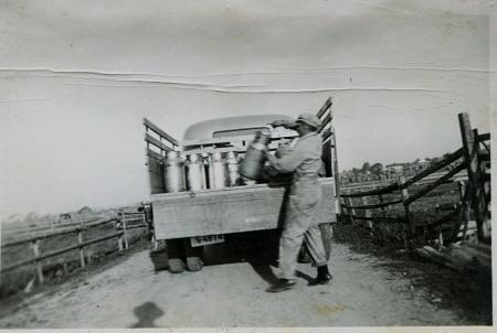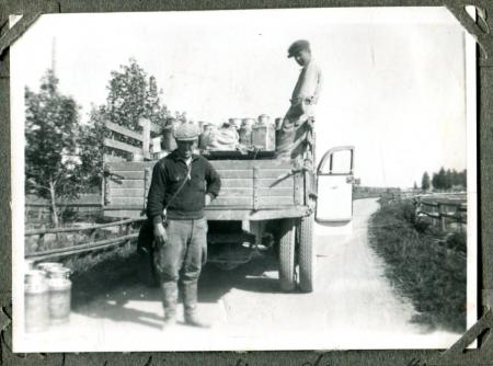 | Emil Rodas, född 1912, stående på marken, hans bror Erik född1922, lyfter hinken med mjölk. | |