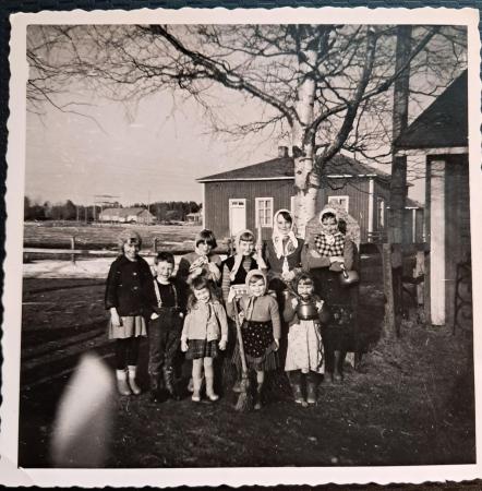 | Påskafton 1963 eller -64, fotograferade vid Paxaltået. I bakgrunden Tölby Bönehus, längre bort Valdes och Ingas uthusbyggnad. | |