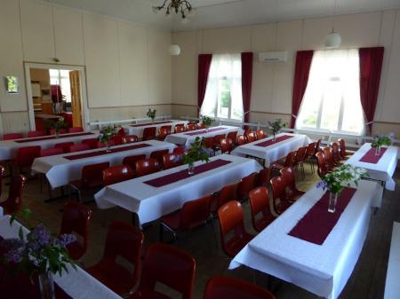 | Hembygdsföreningens festsal dukad för Korsholms pensionärsförenings plättkalas 2017 | |