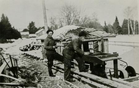På bild Anselm Näs och Arvid Österholm vid Tölbys cirkelsåg. Cirkelsågen anskaffades 1934 av Arvid Österholm född år 1897, Teodor Enegren född år 1908, och Harald Martin född år 1914.