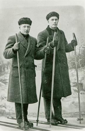 På fotografiet syns till vänster Evert Påfs och till höger Evert Enegren. Fotograferade på en fotoateljé studio i Vasa under mitten av 1910-talet stående på Kajanaskidor och med skidstavar. Till utstyrsel har de båda Krimskinnsmössor, paletå, handskar, söndagsbyxor och knäppkängor.