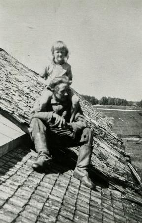 Taken, i synnerhet uthus och lador täcktes med pärtor in på 1960-talet. Pärtorna var ca 35 cm långa och lades så de blev ett tredubbelt lager omlott. Skulle stora tak täckas med pärtor bjöds till "täckankalas" och ett tiotal eller fler inbjöds till talkoarbete. Under arbetets gång bjöd värdparet på både köttstuvning och kaffe med tillhörande vetebröd. På bilden Johannes S-son Påfs spikande pärtor på fähustaket. Han får på bilden "hjälp" av sonen Johan Erik född år 1949 sittande på sin fars axlar.