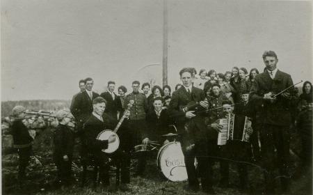 Orkestern bestod av följande medlemmar från vänster: Arne Smeds banjo, Emil Rodas trummor, bandets ledare Axel Hallbäck från Vasa fiol, Teodor Enegren dragspel och Valter Rodas fiol. Arne, Emil, Teodor och Valter var alla Tölbybor. Vi har inga uppgifter om hur många spelningar dansbandet Casimé hade de år de var verksamma. Bröllopsgästerna i bakgrunden på fotot kunde dansa till takterna av bandet.