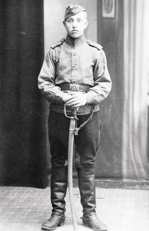 Fotoateljé fotografi av August Glasberg i militäruniform med svärd.