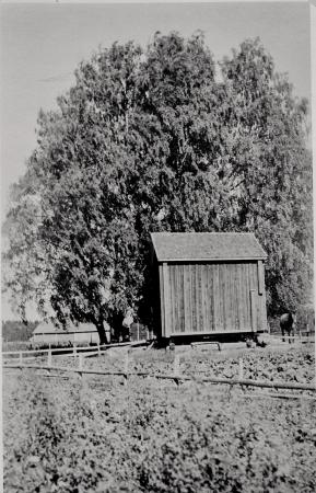 En stilren och vältimrad och överbyggd spannmålsboda vid Påvis, troligen byggd i mitten av 1800-talet. Stoet Nella framför boden. De stora yviga björkarna gav gården namnet Björkén i mitten av 1920-talet. En del av Evert Påfs ekonomiebyggnad skymtar fram under björkarna bakom boden. 1952.