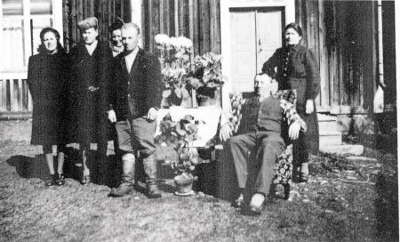 Från vänster på fotografiet: Etel Uppgård, gift Smeds i Solf, Rut Forth gift Martin, Ines Björkén gift Vesterlund, rysk krigsfånge som arbetade på Forths gård, Erik Forth och hustru Edit f. Klockars i Höstves.