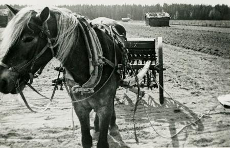 Såmaskinen är av märket Radix och tillhör Johannes U:son Påfs, "Tåmosas- Hannes". Han har en del av åkern på Sävviken sådd, men ännu en del av åkern ännu oharvad.