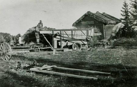 I förgrunden till vänster kärrhjul som sattes under motorn när den förflyttades med häst. De små järnhjulen med skacklar sattes fast i tröskverket under matarbordet vid förflyttning av verket. Selma Thölix, född år 1897 och död år 1973, tillsammans med hästarna. Sädeskärvarna som skördats med självbindare kördes till tröskverket med häst. Ladan som först har fyllts med halm, är en gammal sjuderlada från början av 1800-talet, vilket bevisas av hålet i röset där två bräder spikats för.