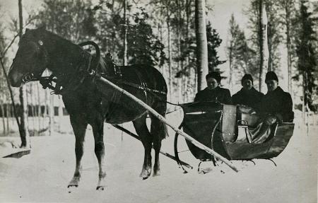 Ett vackert och välvårdat sto som dragare. Huvudlaget med blänkande betselringar och "flektörn" med hästhuvud under örat. Tömmar av tyg. Remtyget med beslag och "sidolk" med pingelklocka på hästryggen. "Kibika" eller "tjibiko" av nyare modell. Ressällskapet i baksätet, Oskar Vikman och bredvid honom byggmästare Edvard Granholm, en släkting till Oskar som var bosatt i Amerika som var på Finlandsbesök och är nu troligen stadd på återresa till USA Detta var 1920-talets "taxi" på oplogade landsvägar vintertid.