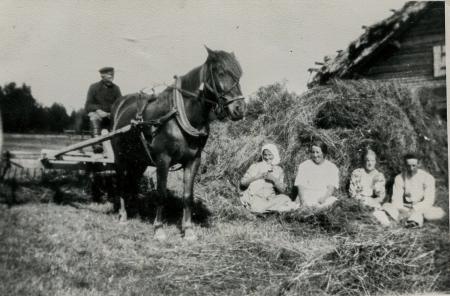 Sittande på Palmkrantz räfsmaskin, tillverkad i Sverige av trä, sitter den dåvarande husbonden Simon Påfs. Simon var född år 1859 och dog på senhösten 1939 någon månad efter att fotografiet togs. Dottern Hulda, född 1881 dog i början av 1950-talet. Dottern Irene, född 1900. Fästeparet Alma Snickars, född 1910 i Solf och gårdssonen Johannes, född 1896.