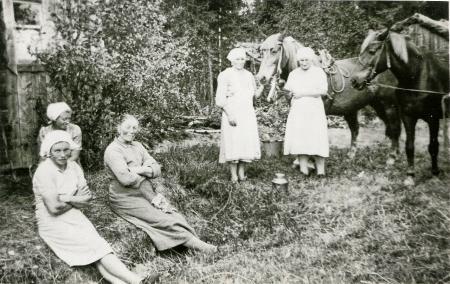 Karl Forths arbetsfolk sittande från vänster: döttrarna Vivi född 1909, och Aili född 1911, samt hustru Hilma född 1877. Stående framför gårdens hästar Freja och Lisa, Hilmas syster Emma Thölix född 1886 och Karls kusin Ester Linden född 1897, båda bosatta i Vasa.