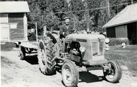Fotografi av John Thölix på väg till höängen med traktor, under 1960 eller 70-talet.