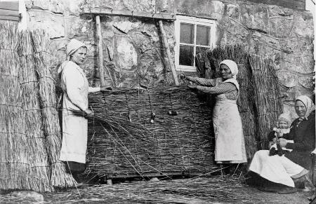Ej namngivna kvinnor i arbete med sävmattor.