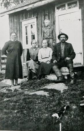 Från vänster: Sofia Rodas (Lill-Fia), sittande Elsa och stående sonen Holger, barn till Alina och Johannes Rodas (Lill-Jannes Johannes). Sofia Rodas var gift med Gustav Rodas, en bror till Johannes. Foto på Bolot i kvällsskymningen.