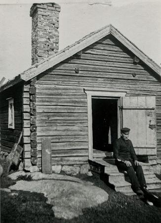 Fotografi av Gustav Forth "Haga Gustav" sittande på trappan till sin fiskarstuga i Bolot.