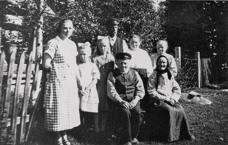 På gårdsplanen framför Karl Dahls gård står från vänster; dottern Signe, Rosa Nylund, Karls yngre dotter Sigrid, Karl själv med skärmmössa, hustrun Maria, och en kvinna från Vallgrund, som är gift med sittande Petter Dahl och som senare antog namnet Storpått. Sittande längst till höger mor till Karl, Matilda Sofia Dahl, i dagligt tal kallad "Kalas-Fasson".