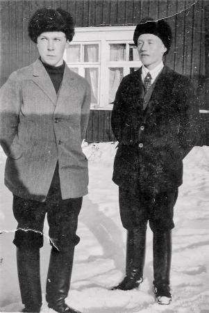 Vinterfoto med goda vännerna Vilhelm och Bertel. Fotot frå 1930-talet