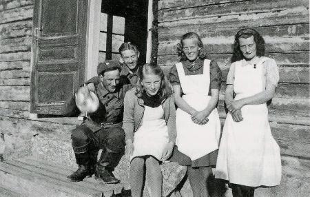 På fotografiet syns två stycken okända soldater på trappan till kantinen i "Lillstu stugan" tillsammans med lottorna Ella Smulter (Enegren), Margit Englund (Granholm) och Aili Enegren (Sand).