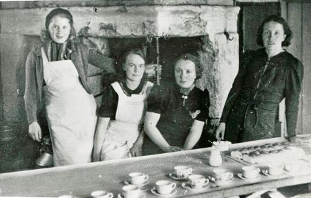 Serveringsflickor krigsvintern år 1940 i kaffestugan. Koppar och bullaskivor med grädde och socker framdukat på serveringbordet. En 10-liters kaffepanna står på trefoten i spisvrån. Flickorna från vänster: Ella Enegren, gift Smulter. Anni Boij gift Näs. Saimi Svarfvar, gift Nyberg. Tyra Martin, gift Pada. De väntar på att få servera "Värnemännen" som var förlagda i Ungdomshuset och folkskolan.